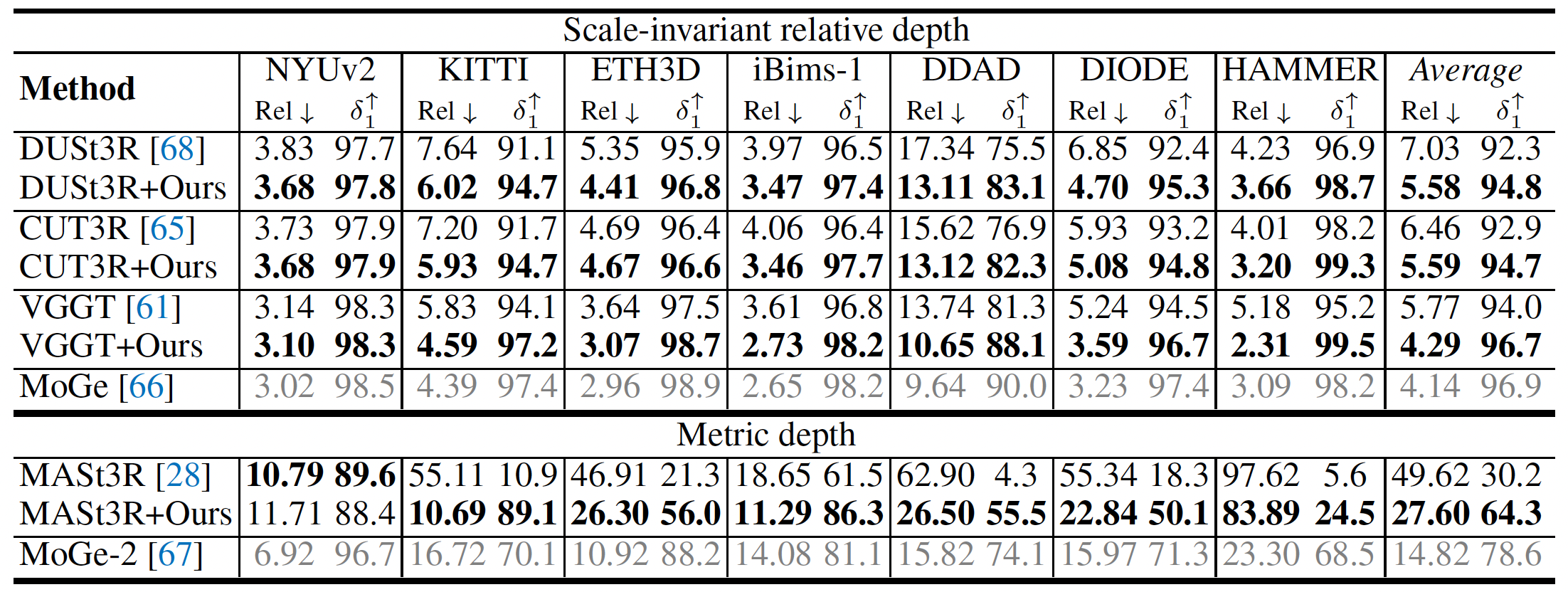 Our fine-tuning method consistently improves the monocular depth estimation quality of various feed-forward 3D reconstruction models, including both two-view and multi-view, relative depth and metric depth models.