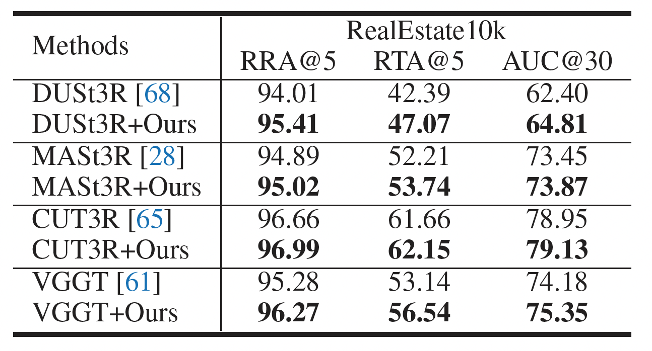 Our fine-tuning method consistently improves the pose accuracy of various feed-forward 3D reconstruction models, even without pose supervision during training. This suggests that the decoder functions as an implicit feature matcher, leveraging the improved encoder features to enhance performance without requiring explicit pose labels.